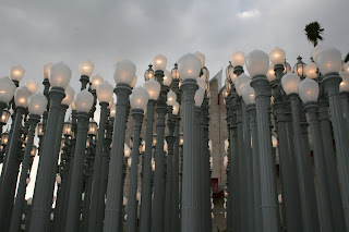 Artist Chris Burden’s permanent installation at the “new” Los Angeles County Museum of Art, “Urban Light,” comprised of 202 antique street lights, lit up a a grey ocean of sky today. It was the first full test of the lights, which are anchored in the courtyard between the “old” LACMA buildings and the new — the Broad Contemporary Art Museum (BCAM).
